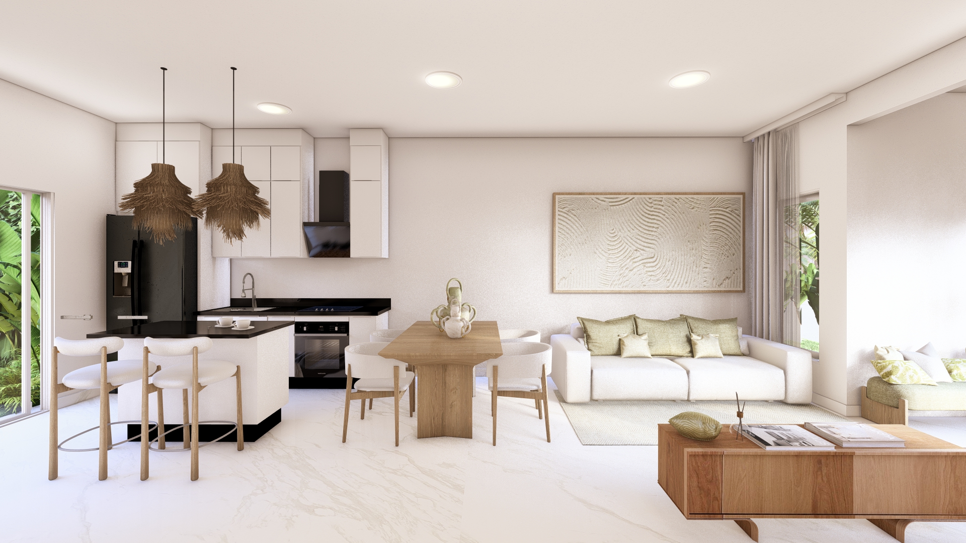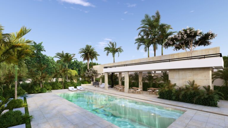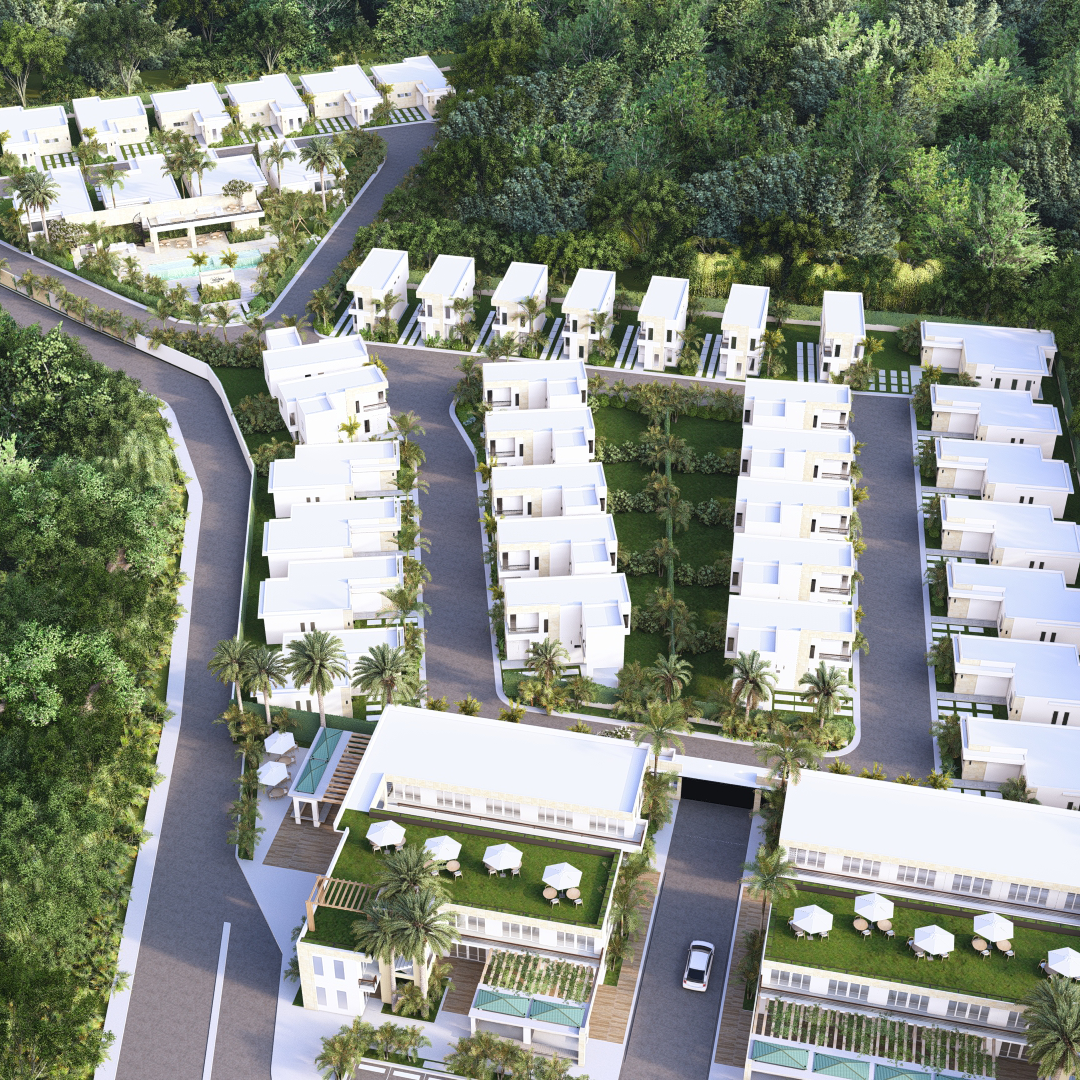LAS VILLAS DE UNO Y DOS NIVELES, RODEAN UN AREA SOCIAL CENTRAL CON UN CONCEPTO OASIS CERCA DE LA PLAYA